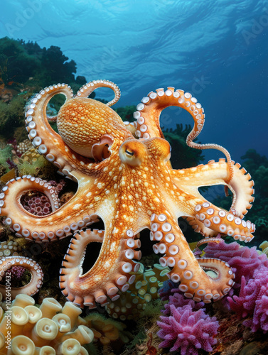A vibrant octopus with curled tentacles moves gracefully among coral in the clear, blue ocean waters.