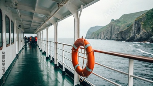 A vibrant orange lifebuoy hangs on the railing of a ship's deck, offering a view of rugged cliffs and the vast ocean, conveying a sense of adventure and safety during a coastal journey.