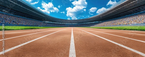 A vibrant, panoramic view of a running track in an empty stadium, under a bright blue sky adorned with fluffy clouds.