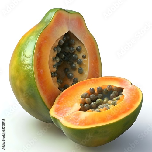 A vibrant papaya cut in half. revealing its juicy orange flesh and dark seeds.