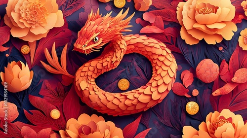 A vibrant paper-cut illustration of a snake wrapping around "2025," adorned with peonies, goldfish, and lucky coins, delicate cut-out patterns in bold red and gold,
