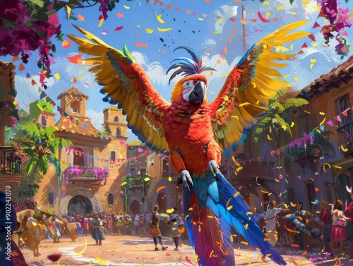 A vibrant parrot showcases its colorful feathers amidst a lively festival scene filled with confetti and joyous celebration.