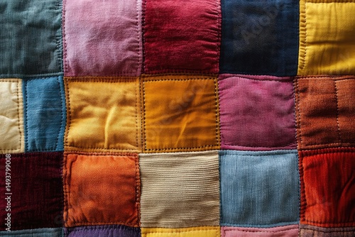 A vibrant patchwork quilt composed of various corduroy squares in rich autumnal hues, showcasing intricate stitching.