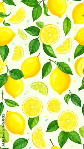 A vibrant pattern of lemons and leaves on a light yellow background