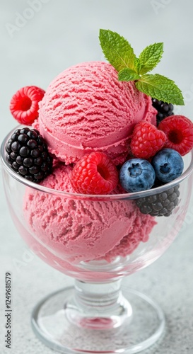 A vibrant pink berry ice cream scoop garnished with fresh raspberries, blackberries, blueberries, and mint.