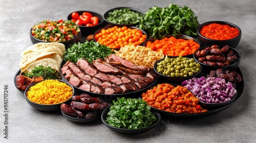 A vibrant platter featuring grilled meat, various salads, couscous, chickpeas, dates, and other assorted Middle Eastern dishes.