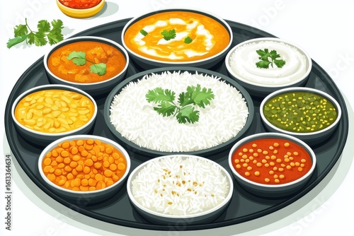A vibrant platter of Indian cuisine featuring various curries, rice, and sauces in decorative bowls.