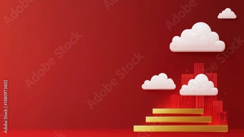 A vibrant red background features stylized golden steps with playful clouds, ideal for graphics about growth, achievement, or aspirations, Use in creative projects, marketing