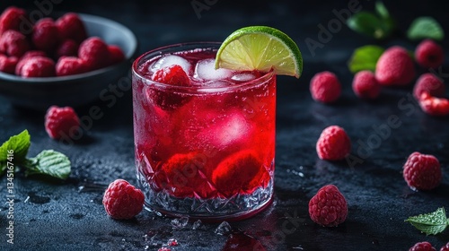 A vibrant red drink with a lime wedge and raspberries floating in the glass, set on a dark, moody background with fresh berries.