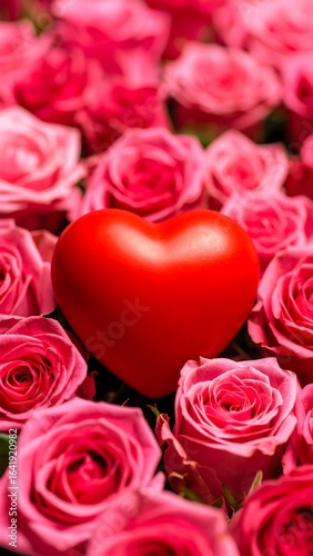 A vibrant red heart nestled amongst a profusion of pink roses
