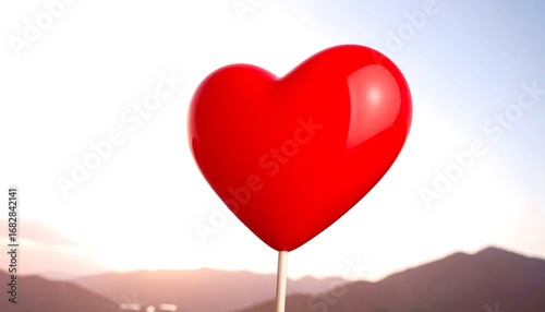 A vibrant red heart-shaped balloon on a stick against a hazy mountain backdrop