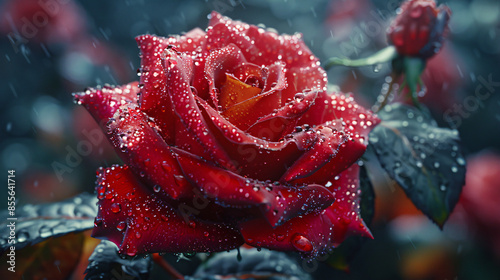 A vibrant red rose unfurling its velvety petals, with dewdrops glistening on their surface and a hint of yellow stamen in the center.