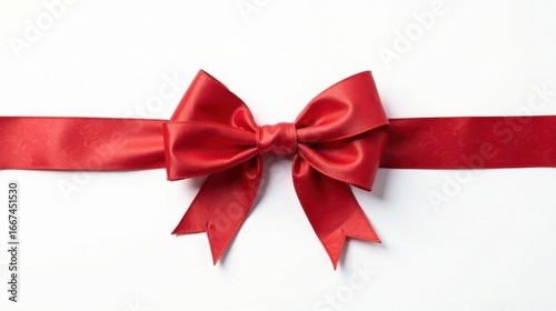 A vibrant red satin ribbon tied in a classic bow, elegantly positioned on a pristine white background, perfect for adding a festive touch to your designs.
