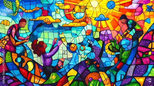 A vibrant stained glass artwork depicting people interacting with nature and the sun.