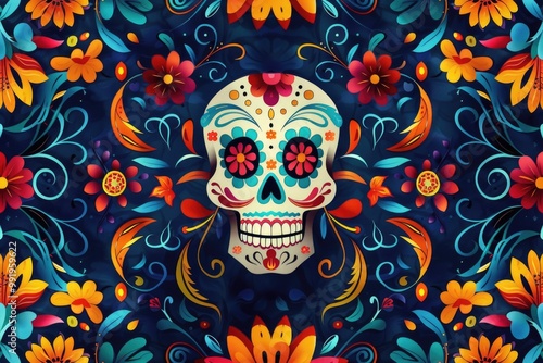 A vibrant sugar skull surrounded by colorful flowers and swirling patterns