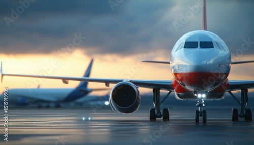A vibrant sunset illuminates an airplane on the runway, highlighting its sleek design and powerful engines against a dramatic sky.