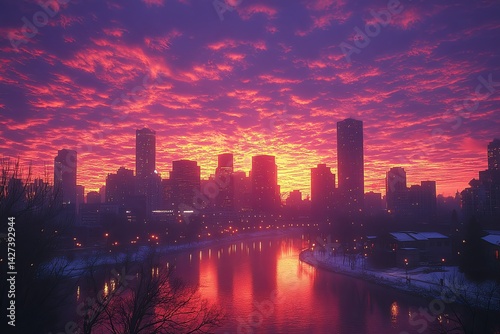 A vibrant sunset illuminates the city skyline over a winter river