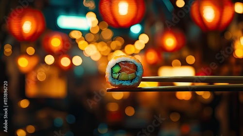 A vibrant sushi roll held by chopsticks, with a backdrop of warm lantern lights in a restaurant.