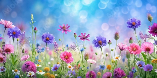 A vibrant tapestry of pink, purple, and blue wildflowers blooms in a lush meadow, bathed in the soft glow of a sun-drenched sky.