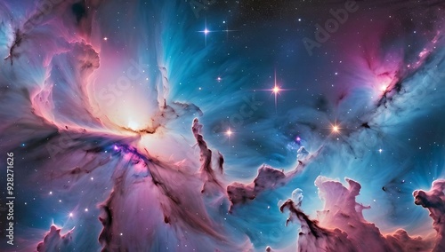 A vibrant tapestry of the cosmos unfolds in hues of blue, pink, and purple, showcasing the dynamic beauty of nebulae, stars, and interstellar clouds in a celestial spectacle.
