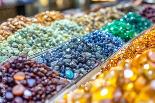 A vibrant traditional gemstone market features an array of colorful raw and polished minerals. Customers explore the vivid displays, highlighting the captivating beauty of natures treasures