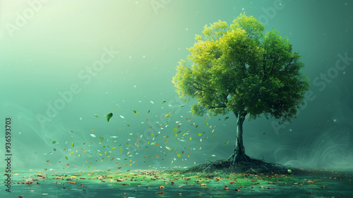A vibrant tree with green leaves symbolizes nature's cleanliness and vitality, standing alone in a serene environment