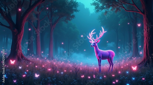A vibrant, whimsical forest scene illuminated by a warm, ethereal glow, where slender neon deer with iridescent fur and delicate, branching antlers prance amidst towering trees adorned with glowing