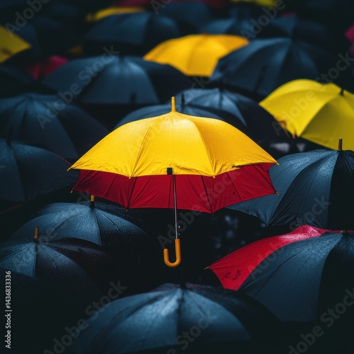 A vibrant yellow and red umbrella stands out among a sea of black umbrellas in a rainy setting.