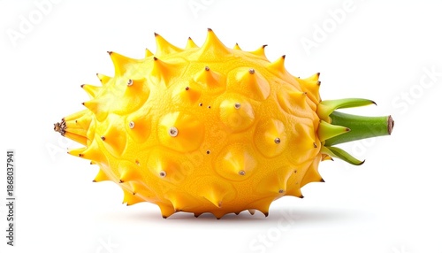 A vibrant yellow fruit with spikes and a green stem, isolated on white