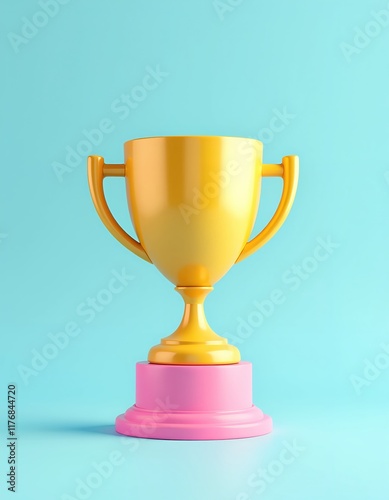 A vibrant yellow trophy sits proudly on a pink pedestal against a light blue background. This cheerful image is perfect for celebrating success, achievements, and victories.