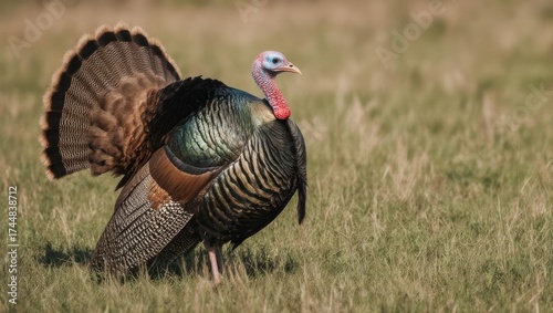 A vibrantly feathered wild turkey stands proudly in a grassy field, displaying its iridescent plumage