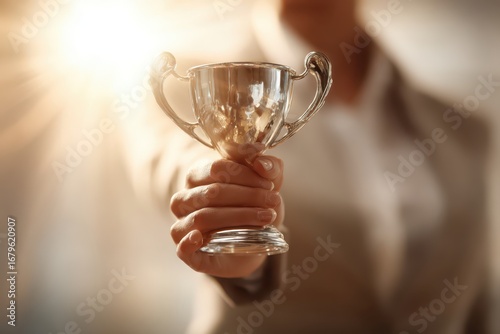 A victorious moment with a gleaming silver trophy held high in warm light.