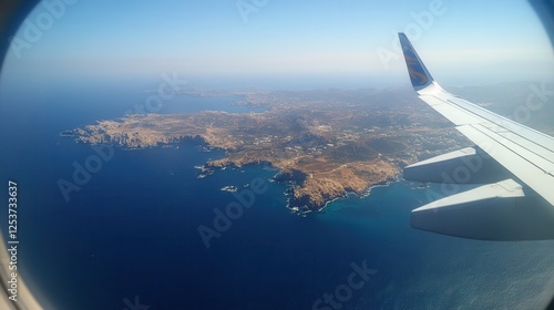 A view from an airplane window of the wing, azure ocean, scenic coastline with green mountains and clouds, evoking a sense of travel, adventure, and aerial photography.