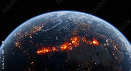 A view from space shows the earth at night with glowing city lights and large areas of intense orange fire or heat
