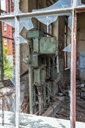 a view into an abandoned factory through the broken window