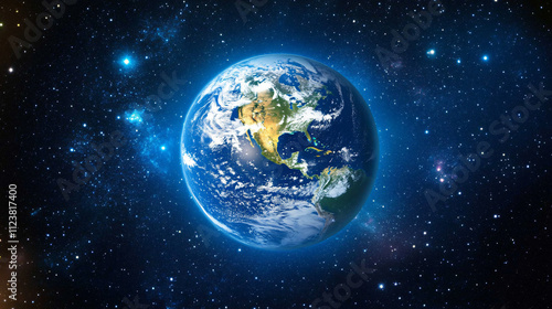 A view of Earth from space, illuminated by the sun with stars sparkling in the distance.