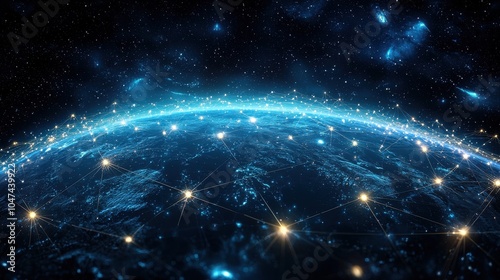 A view of Earth from space showcasing illuminated cities and starry sky over a digital network landscape