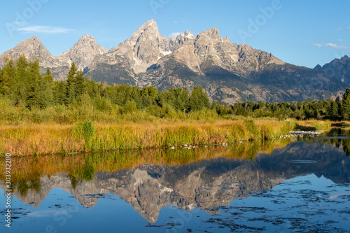 A view of the Grand Teton mountains at sunrise with a reflection in the Snake river from Schwabacher