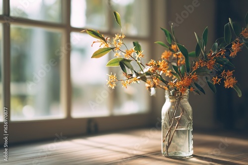 A vintage glass vase filled with fresh orange osmanthus (kinmokusei) branches, on a clean wooden table near a window, minimal and elegant arrangement, warm natural light, calm and fresh atmosphere