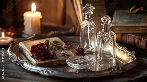 A vintage silver tray with dried roses.