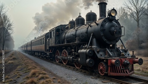 A vintage steam locomotive train chugs through a foggy landscape.