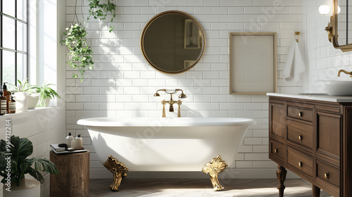 A vintage-inspired bathroom featuring a classic clawfoot tub with gold feet, white subway tiles, and a vintage-style vanity with a round mirror and brass fixtures
