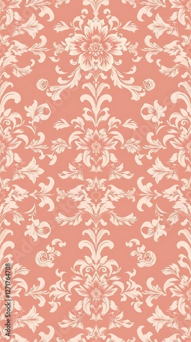 A vintage-inspired seamless pattern featuring elegant floral damask motifs in a muted color palette of blush pinks, soft creams, and dusty rose. The pattern is rendered in a.