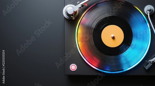 A vinyl record spinning on a turntable, illuminated by colorful lights