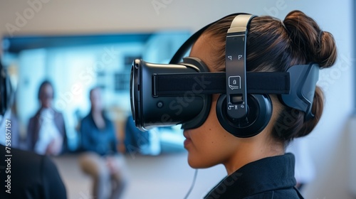 A virtual reality headset projecting diverse workplace scenarios, illustrating how AI enhances HR training programs for inclusive leadership./