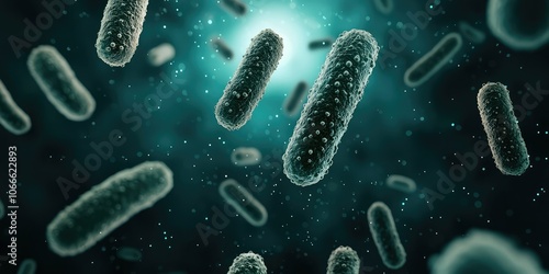 A visual representation of microscopic bacteria floating in a dark, atmospheric setting illuminated by soft blue light.