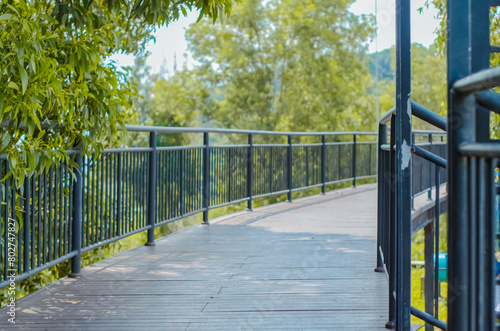 A walkway made of wooden planks with metal fences at either side in a garden with tree branches and leaves around it.
