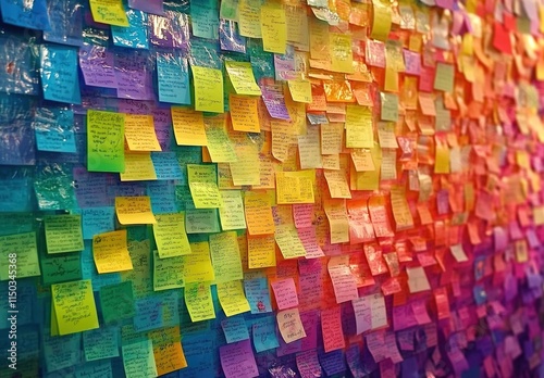 A wall covered in colorful Post-it notes, each note containing unique messages and ideas.