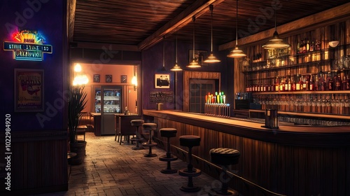 A warm and welcoming bar interior with wooden accents, retro decor, and soft lighting. The dimly lit space invites patrons to unwind