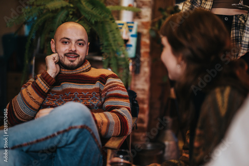 A warm bar atmosphere with friends sharing a conversation, surrounded by rustic decor and plants.